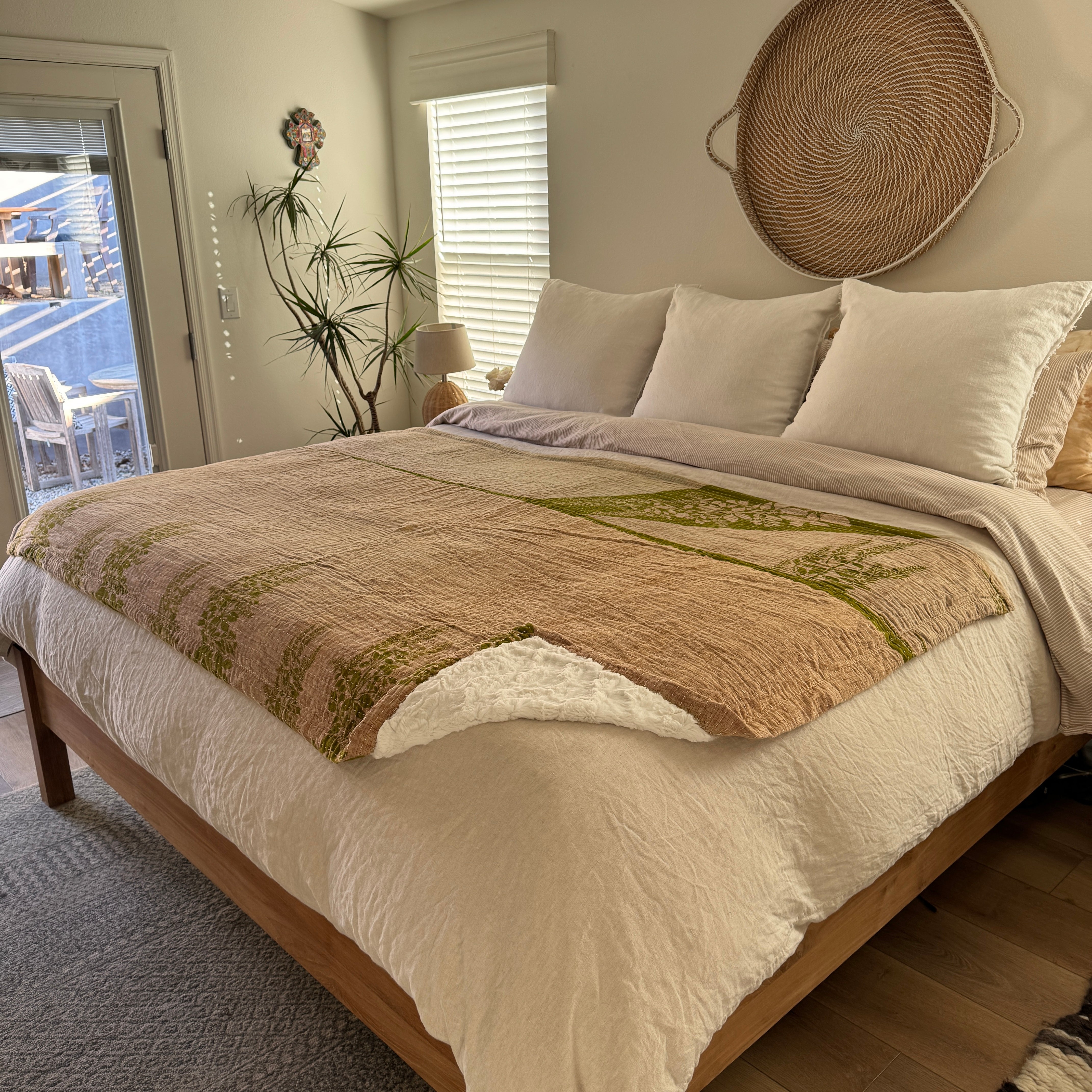 Each blanket is a one-of-a-kind vintage Kantha quilt, originally hand-sewn in India during the 1970s. Crafted from 5–7 layers of recycled saris, they were stitched together by women in community, weaving memory, prayer, and care into every line of thread. We’ve lined each quilt in ultra-soft, weighted minky faux-fur—transforming them into the coziest companions for everyday life.