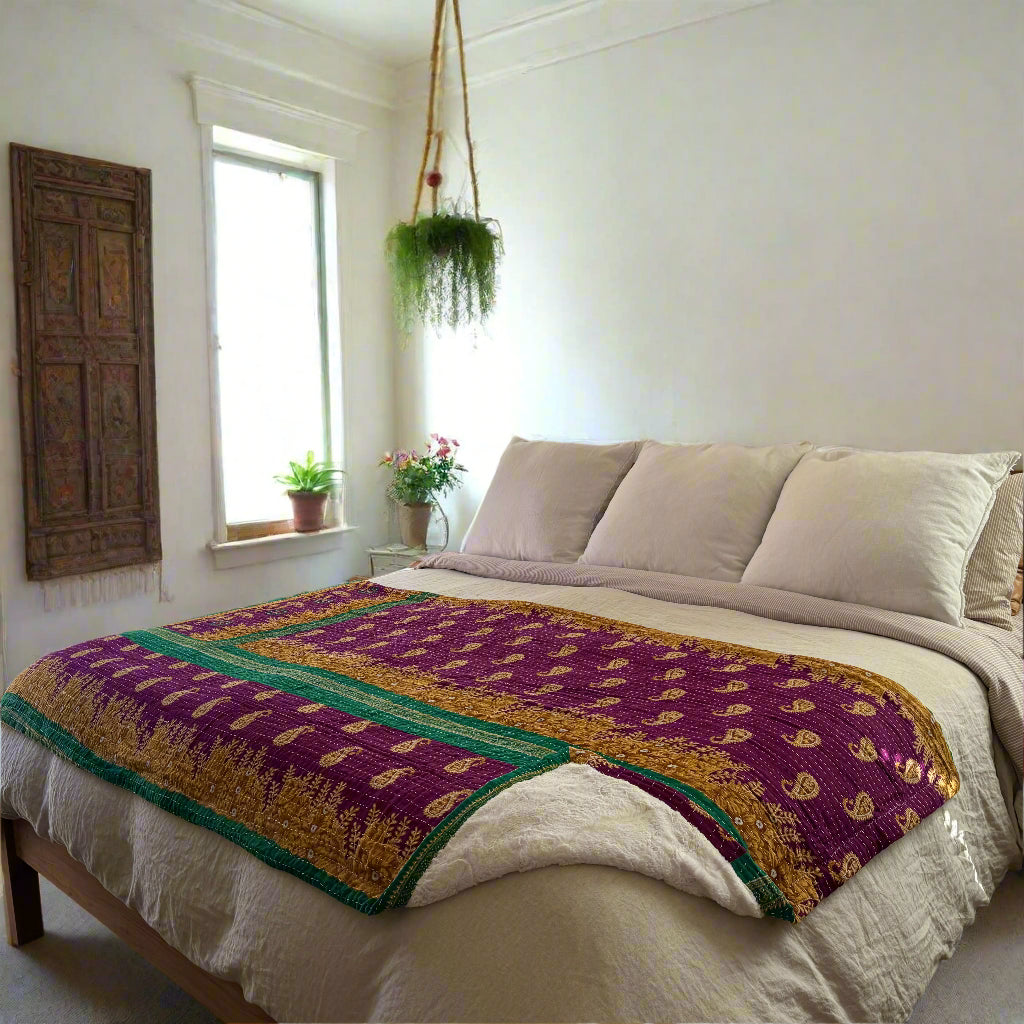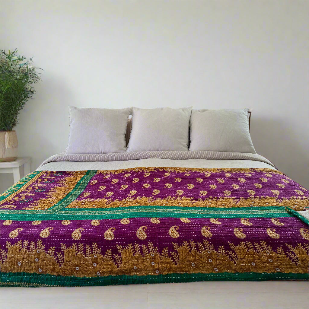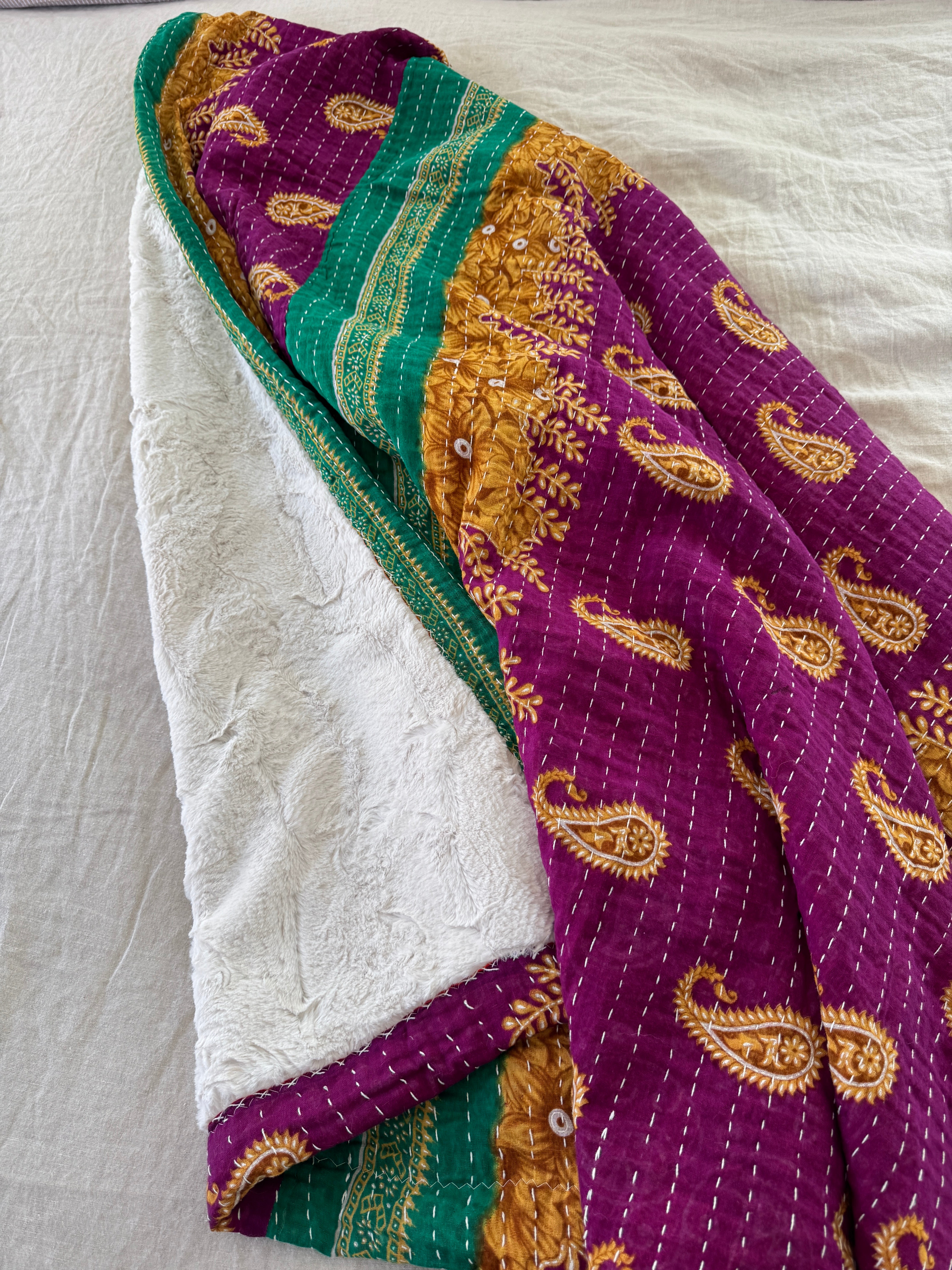 Each blanket is a one-of-a-kind vintage Kantha quilt, originally hand-sewn in India during the 1970s. Crafted from 5–7 layers of recycled saris, they were stitched together by women in community, weaving memory, prayer, and care into every line of thread. We’ve lined each quilt in ultra-soft, weighted minky faux-fur—transforming them into the coziest companions for everyday life.