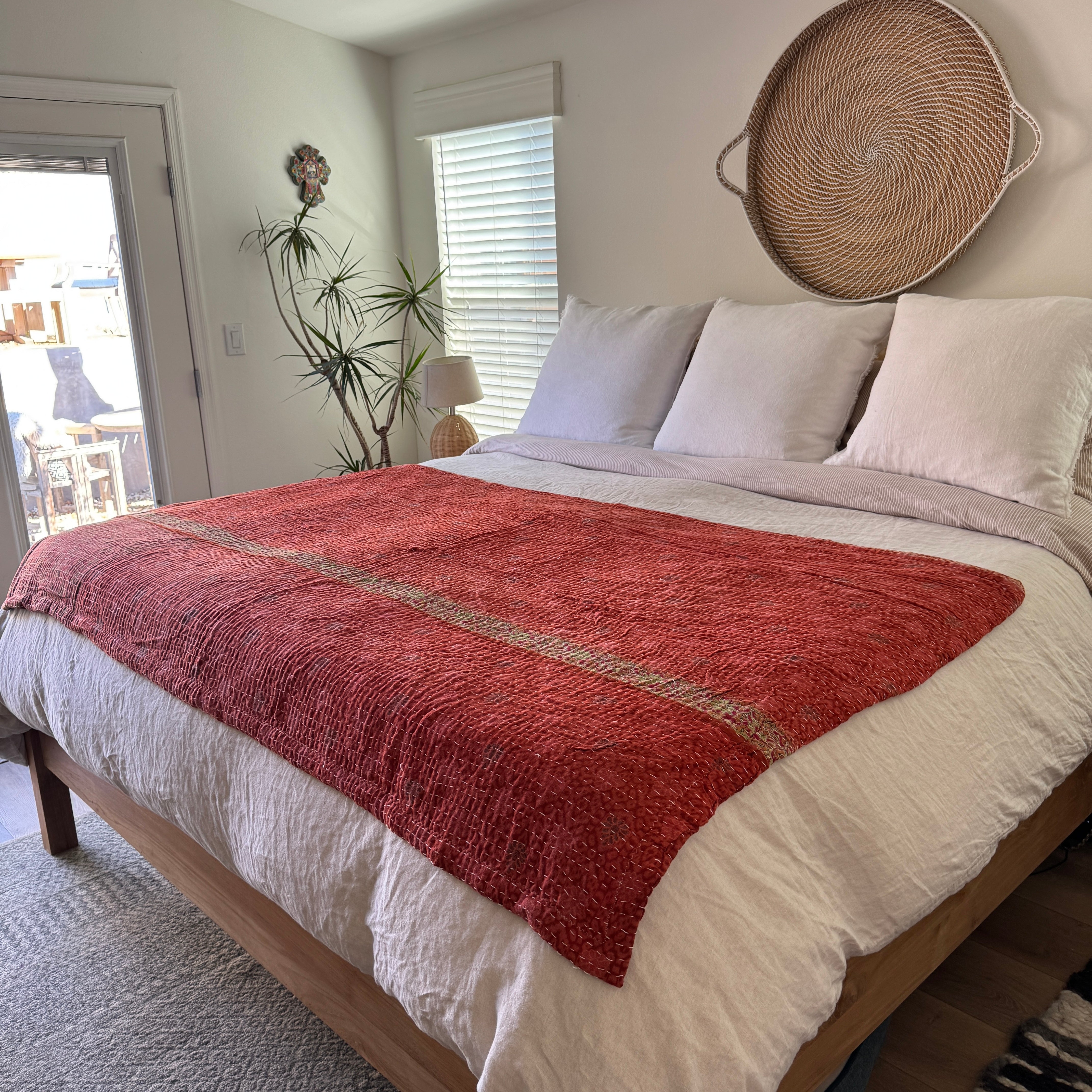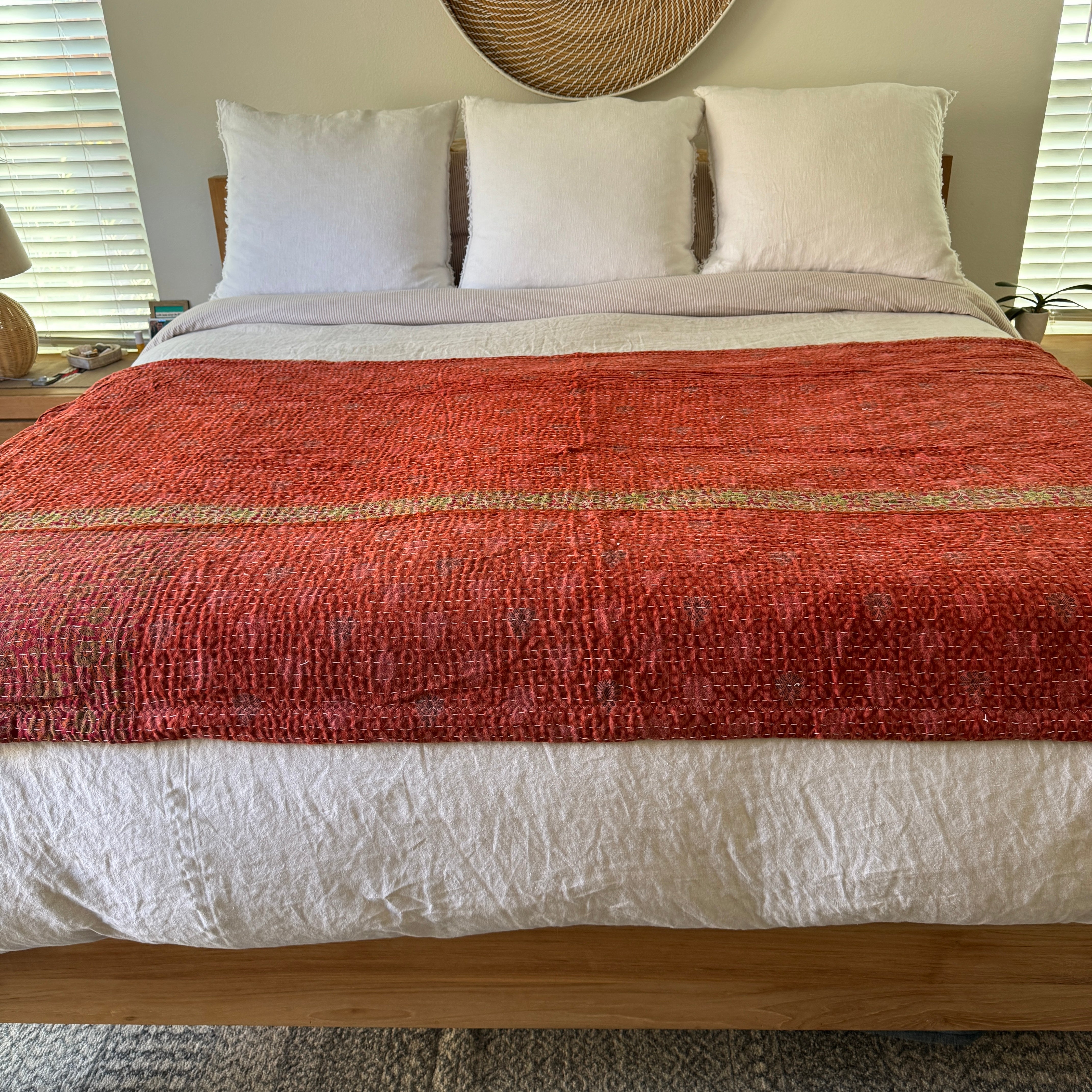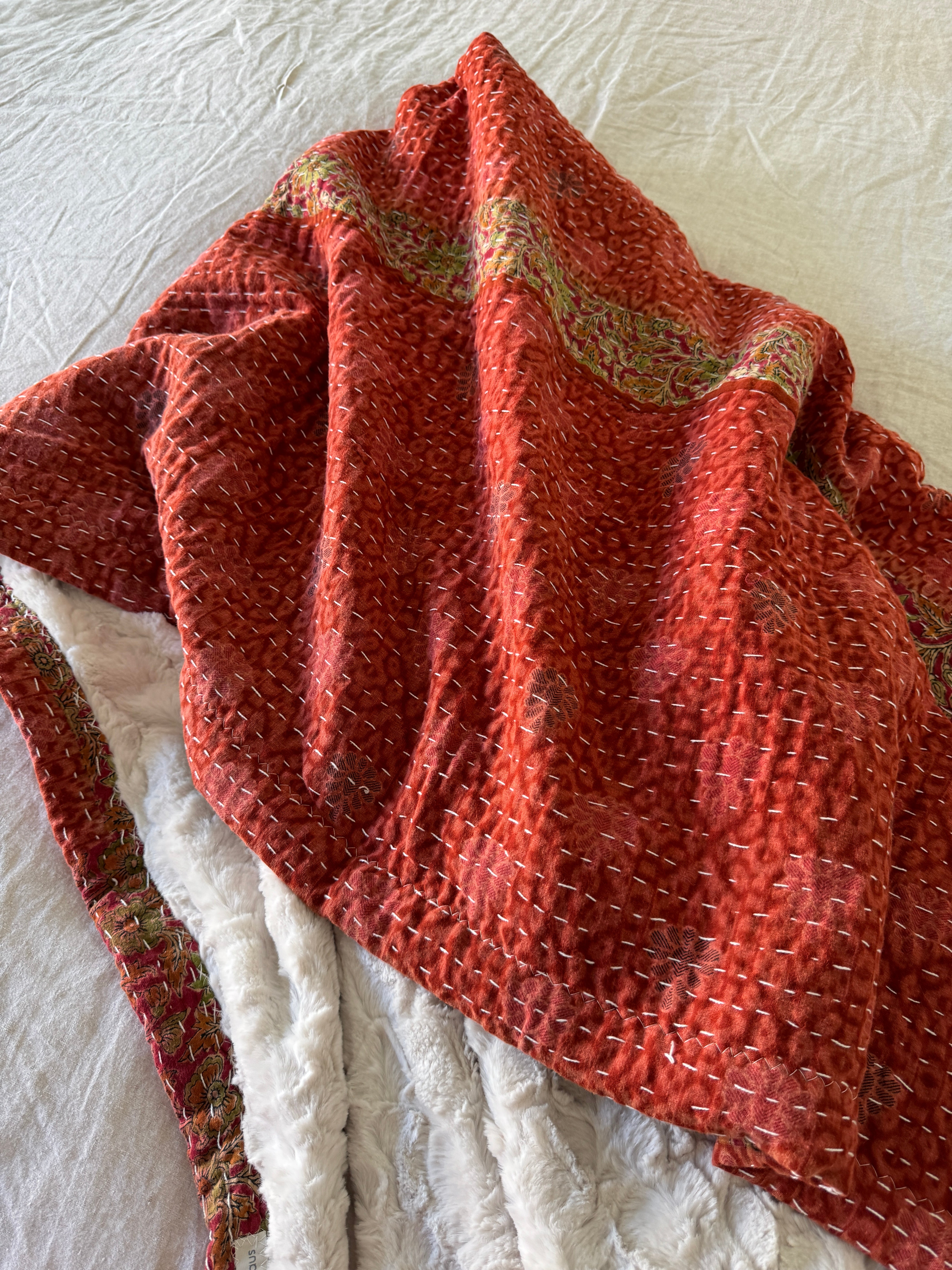 Each blanket is a one-of-a-kind vintage Kantha quilt, originally hand-sewn in India during the 1970s. Crafted from 5–7 layers of recycled saris, they were stitched together by women in community, weaving memory, prayer, and care into every line of thread. We’ve lined each quilt in ultra-soft, weighted minky faux-fur—transforming them into the coziest companions for everyday life.