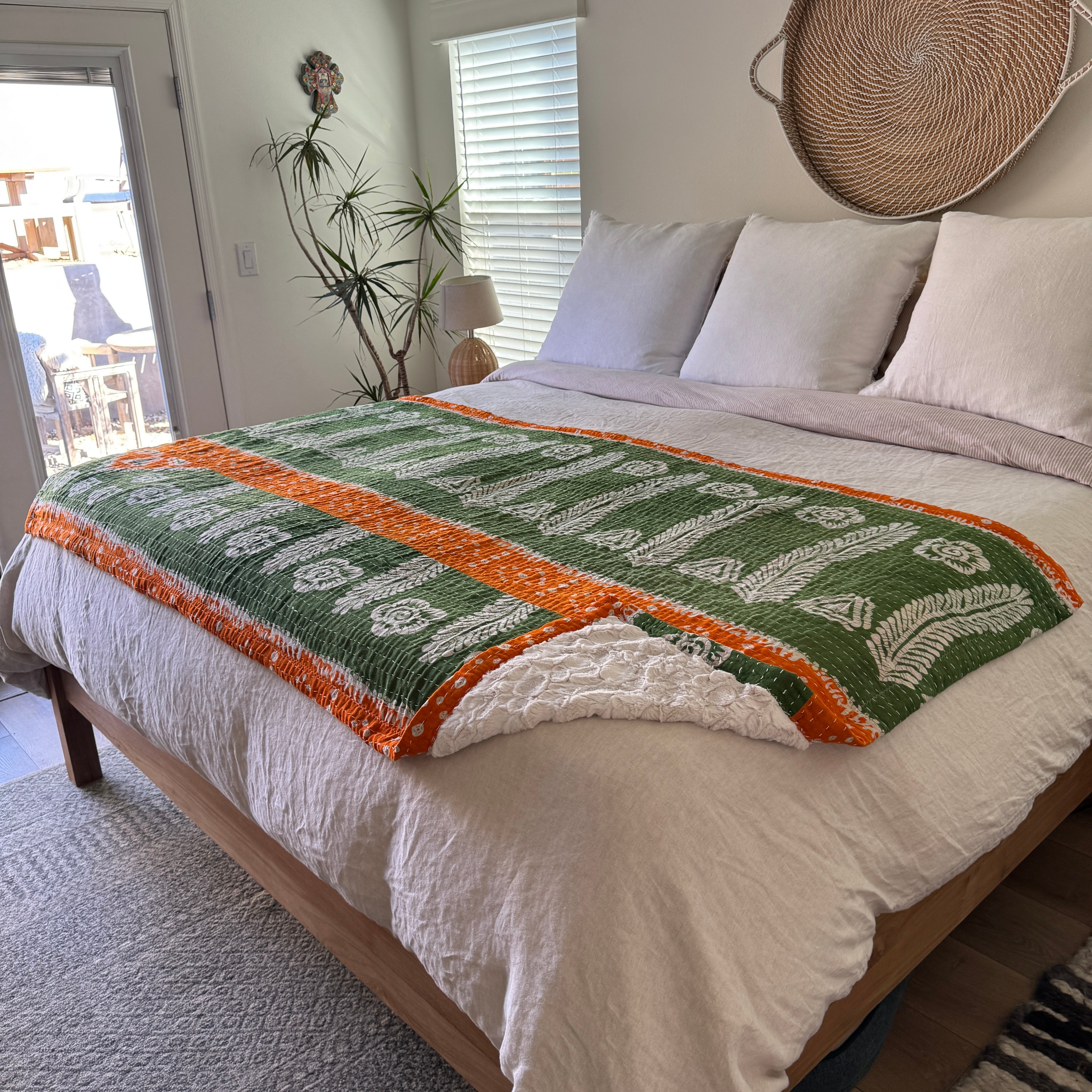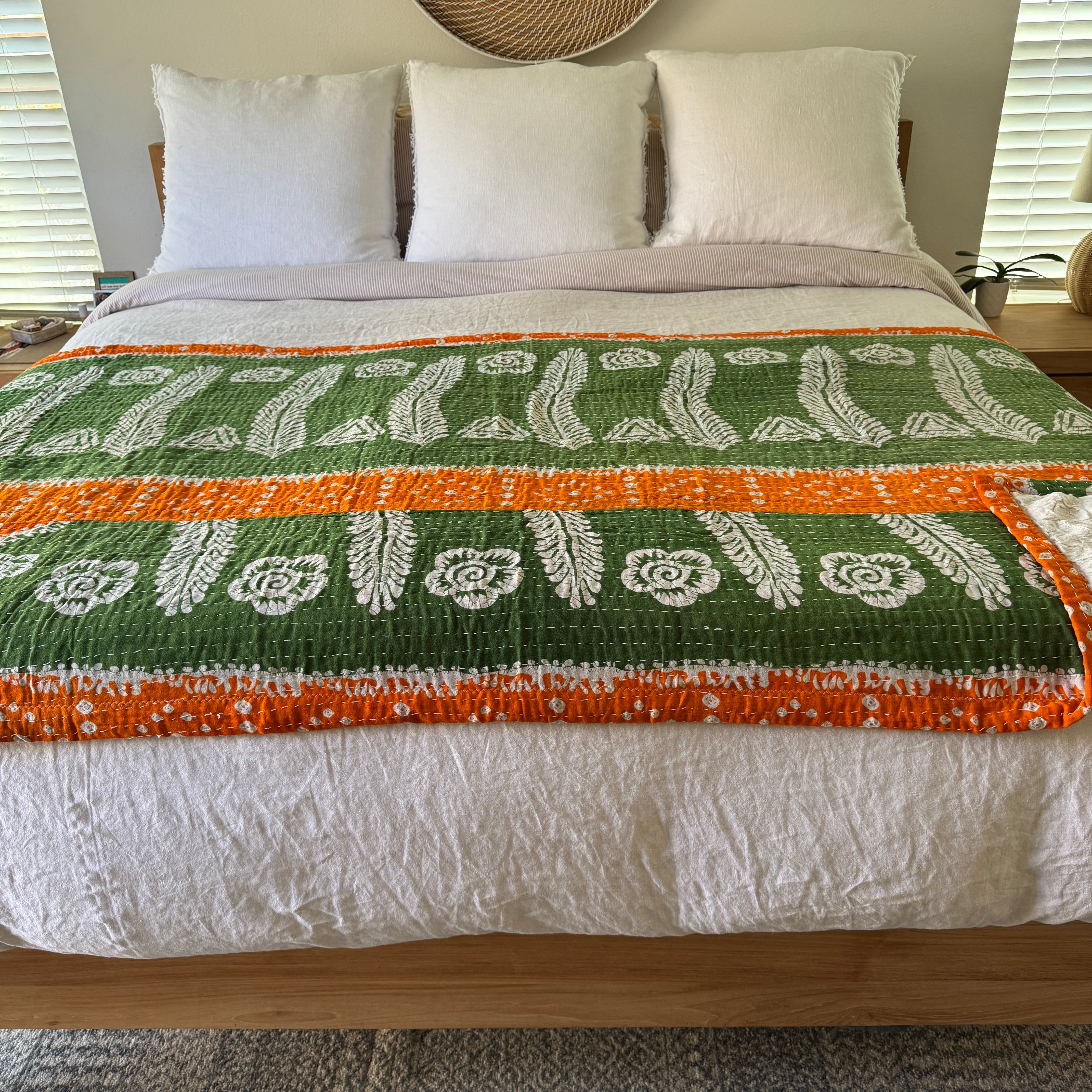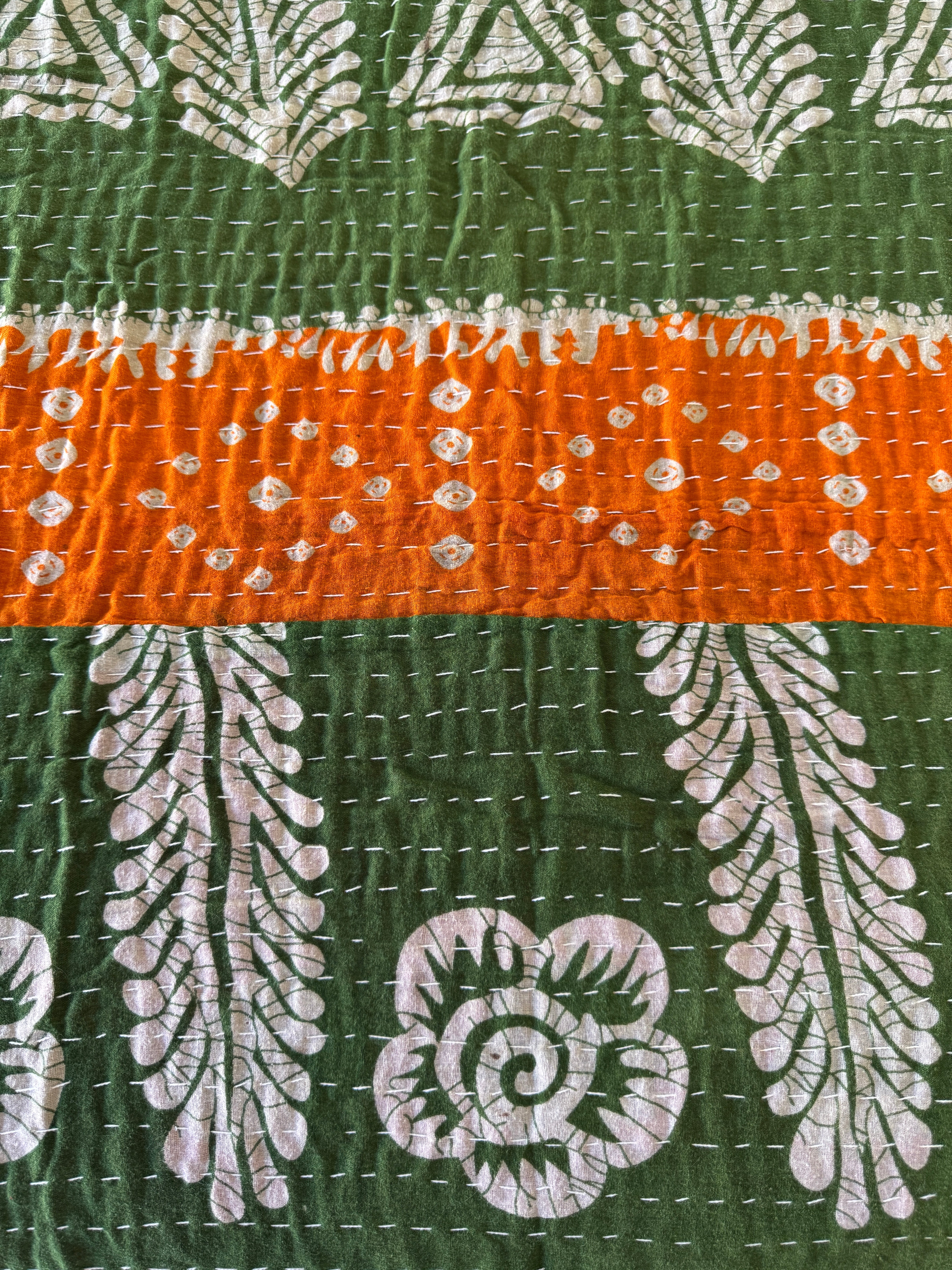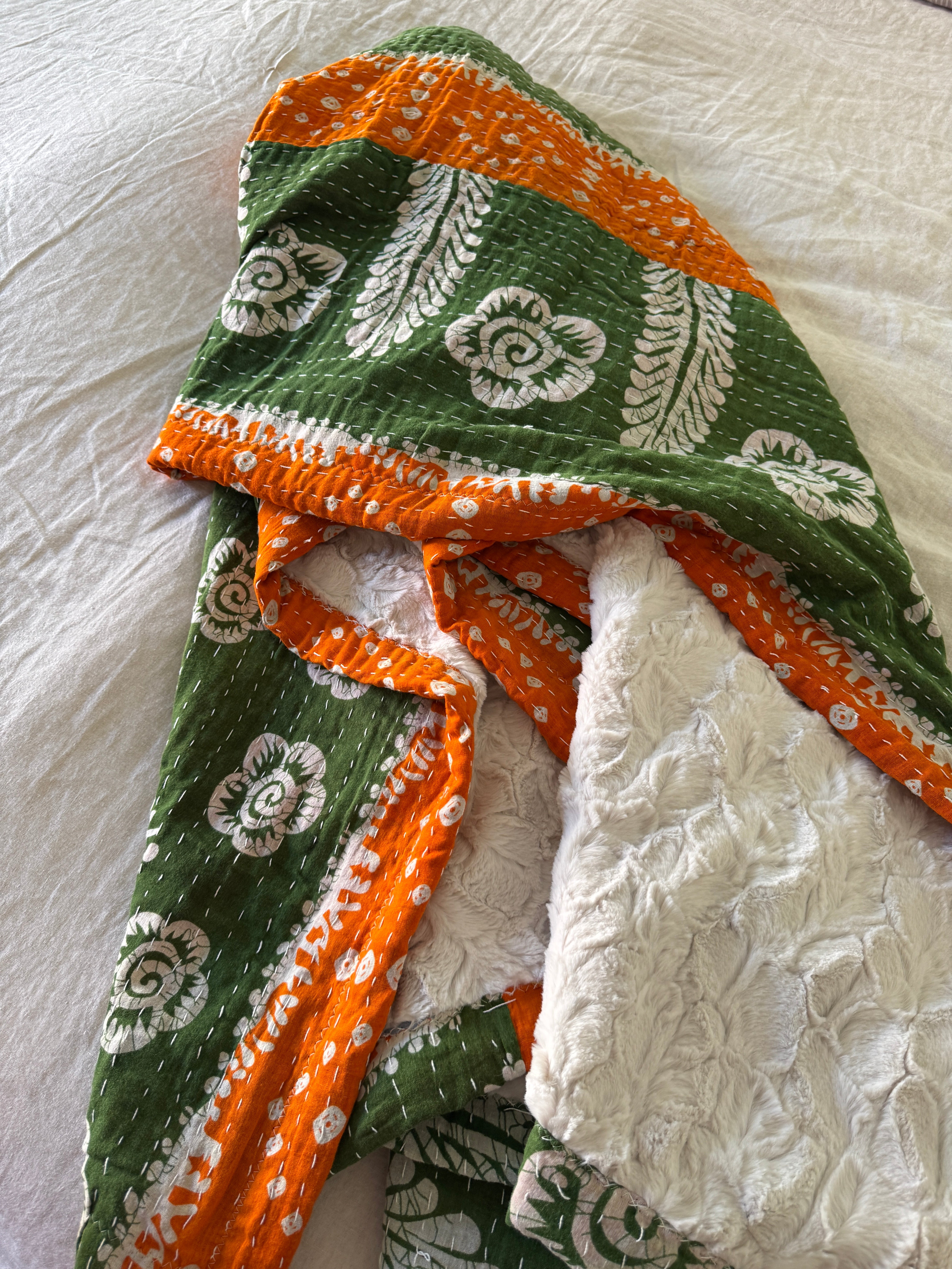Each blanket is a one-of-a-kind vintage Kantha quilt, originally hand-sewn in India during the 1970s. Crafted from 5–7 layers of recycled saris, they were stitched together by women in community, weaving memory, prayer, and care into every line of thread. We’ve lined each quilt in ultra-soft, weighted minky faux-fur—transforming them into the coziest companions for everyday life.