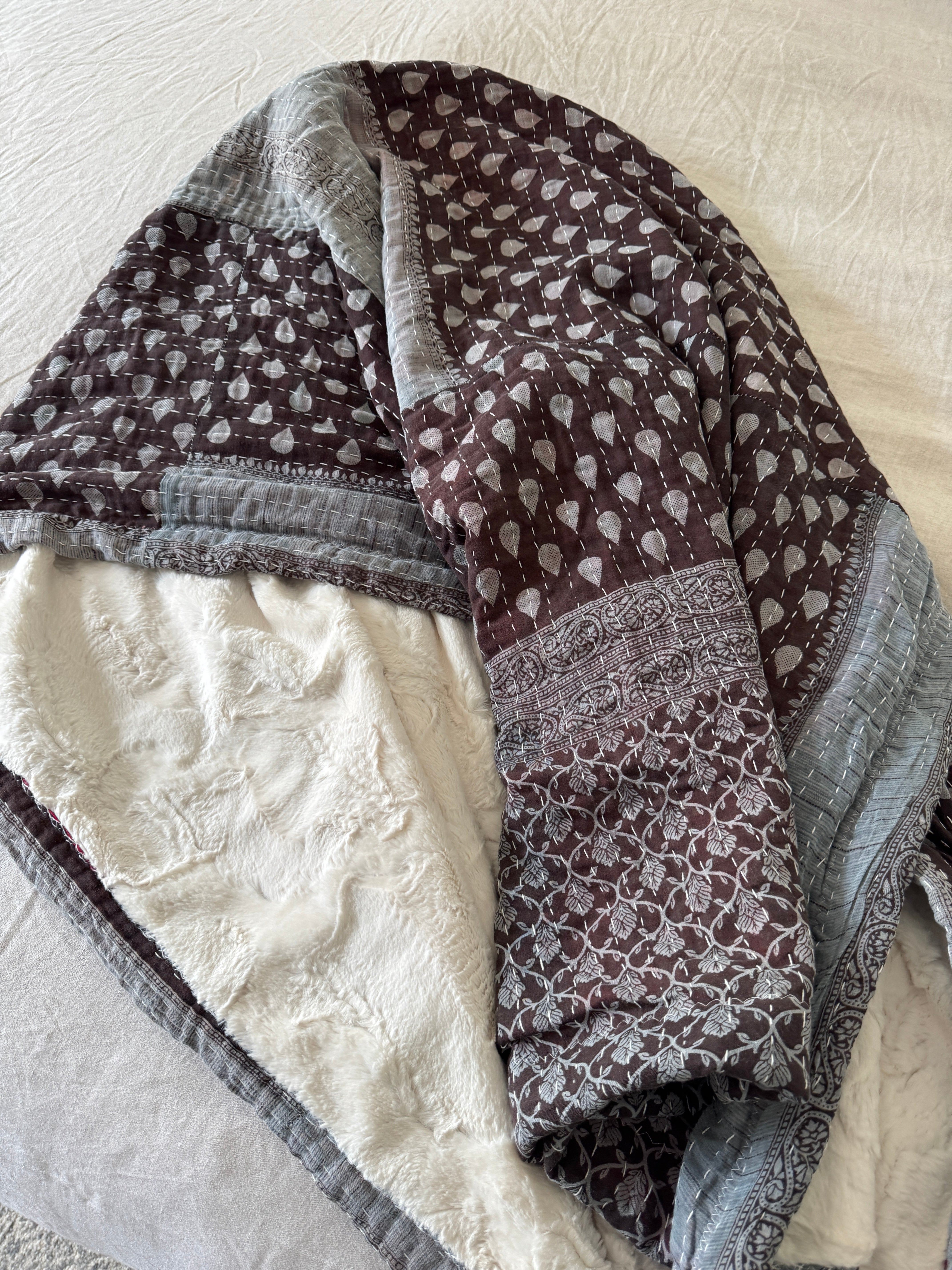Each blanket is a one-of-a-kind vintage Kantha quilt, originally hand-sewn in India during the 1970s. Crafted from 5–7 layers of recycled saris, they were stitched together by women in community, weaving memory, prayer, and care into every line of thread. We’ve lined each quilt in ultra-soft, weighted minky faux-fur—transforming them into the coziest companions for everyday life.