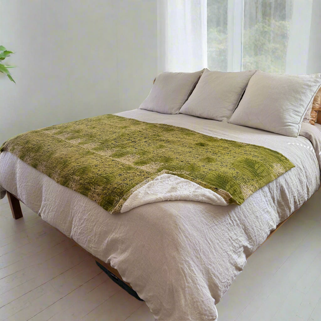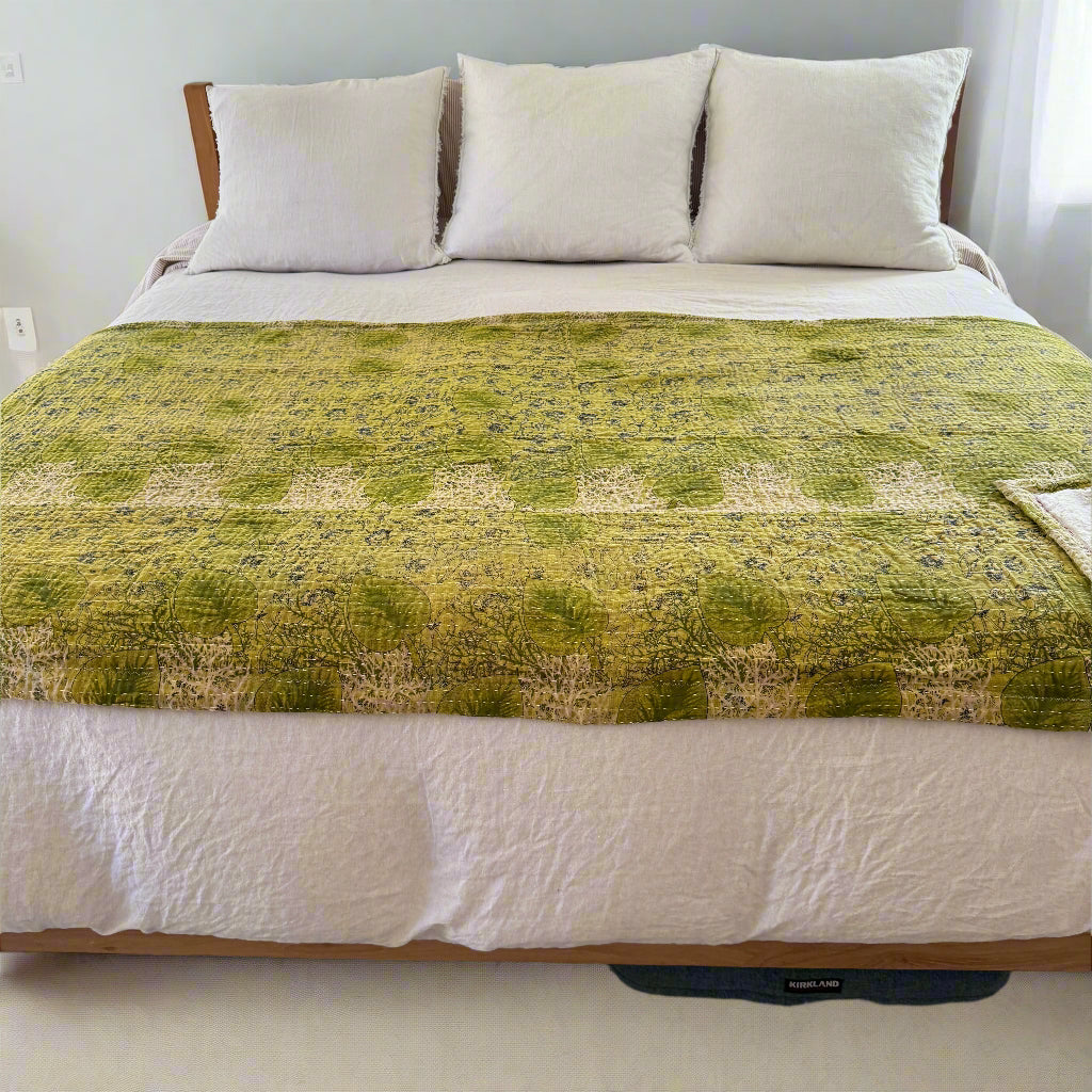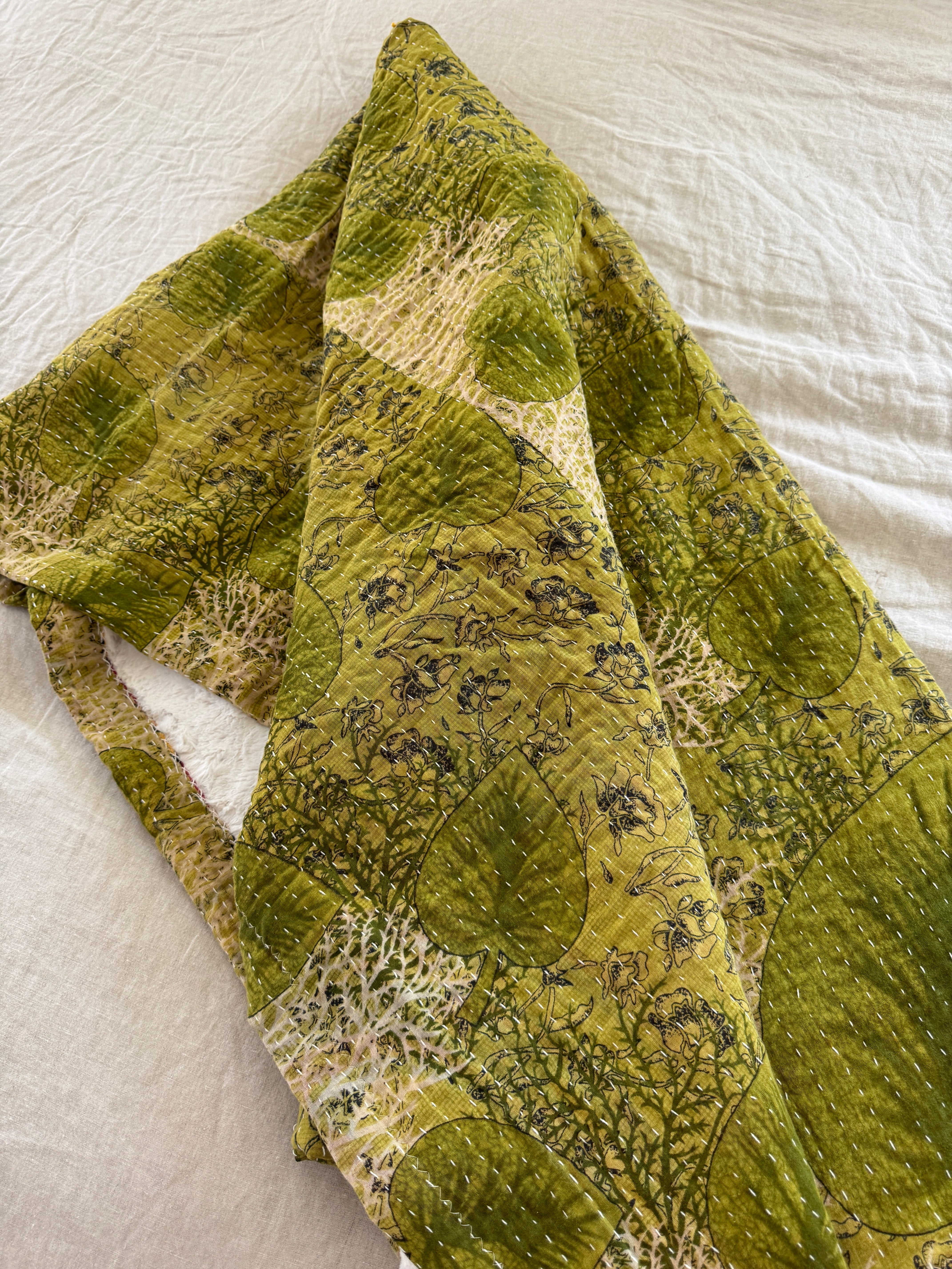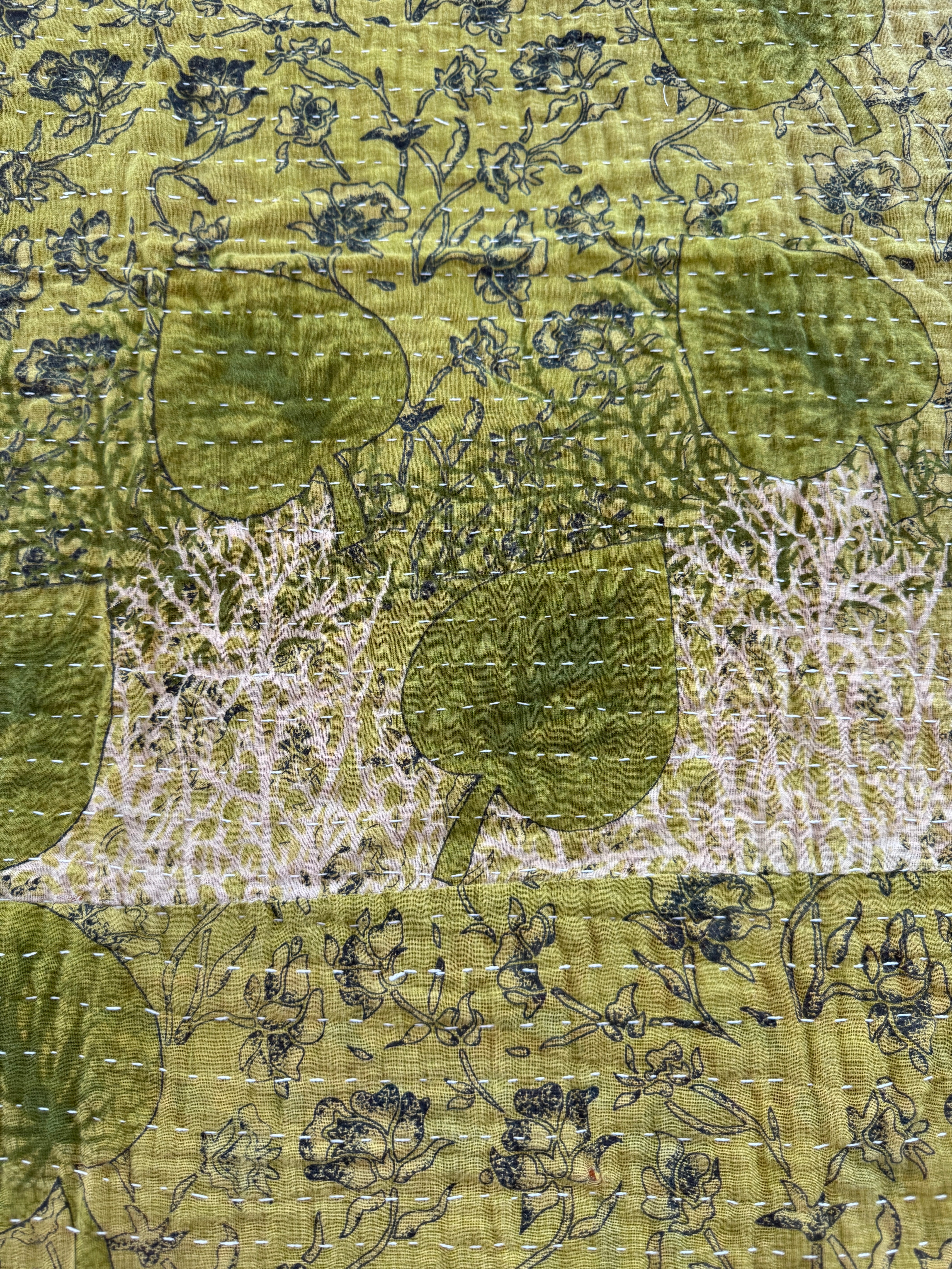 Each blanket is a one-of-a-kind vintage Kantha quilt, originally hand-sewn in India during the 1970s. Crafted from 5–7 layers of recycled saris, they were stitched together by women in community, weaving memory, prayer, and care into every line of thread. We’ve lined each quilt in ultra-soft, weighted minky faux-fur—transforming them into the coziest companions for everyday life.