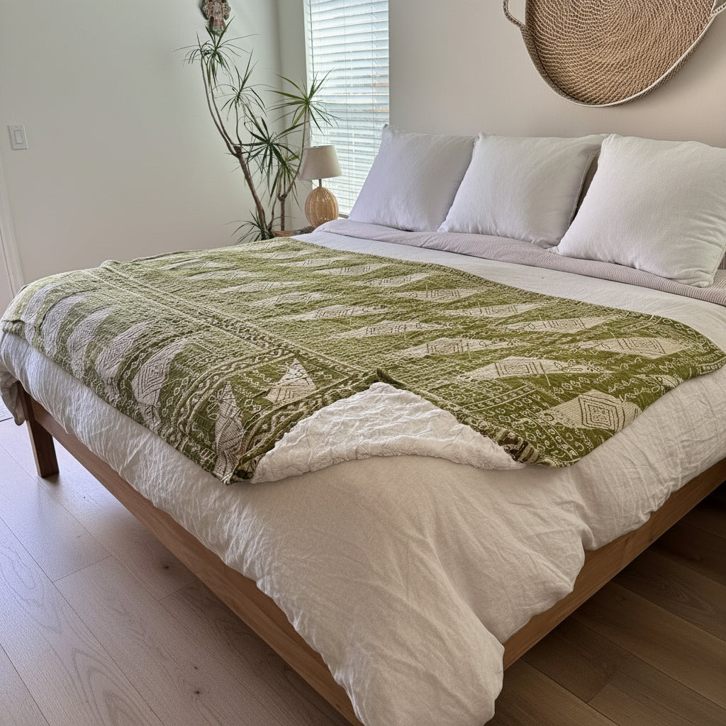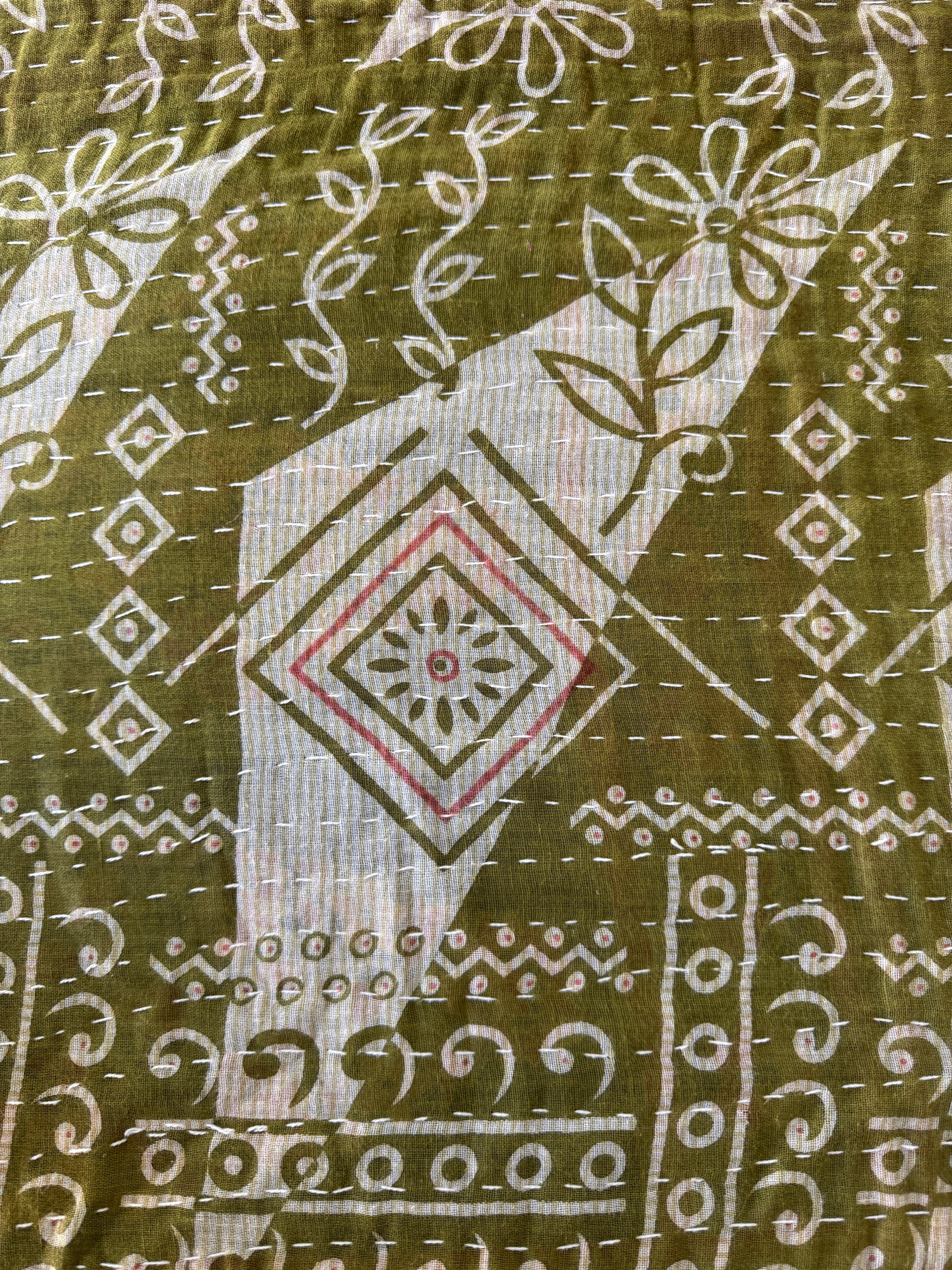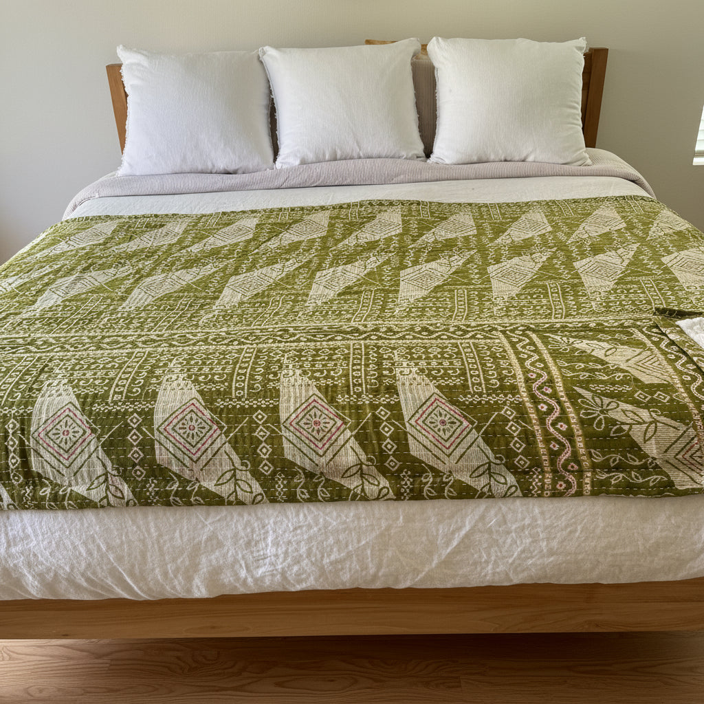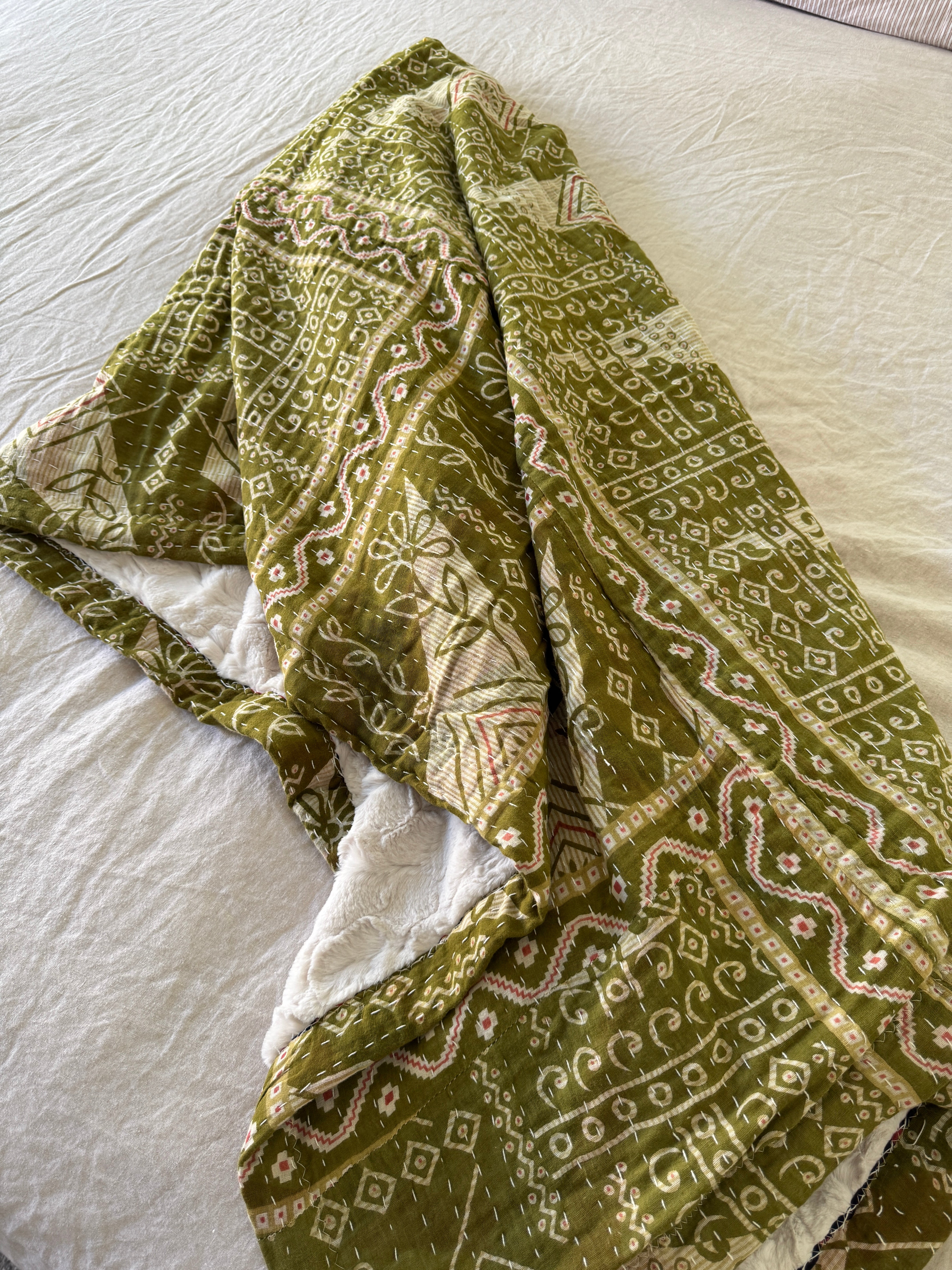 Each blanket is a one-of-a-kind vintage Kantha quilt, originally hand-sewn in India during the 1970s. Crafted from 5–7 layers of recycled saris, they were stitched together by women in community, weaving memory, prayer, and care into every line of thread. We’ve lined each quilt in ultra-soft, weighted minky faux-fur—transforming them into the coziest companions for everyday life.