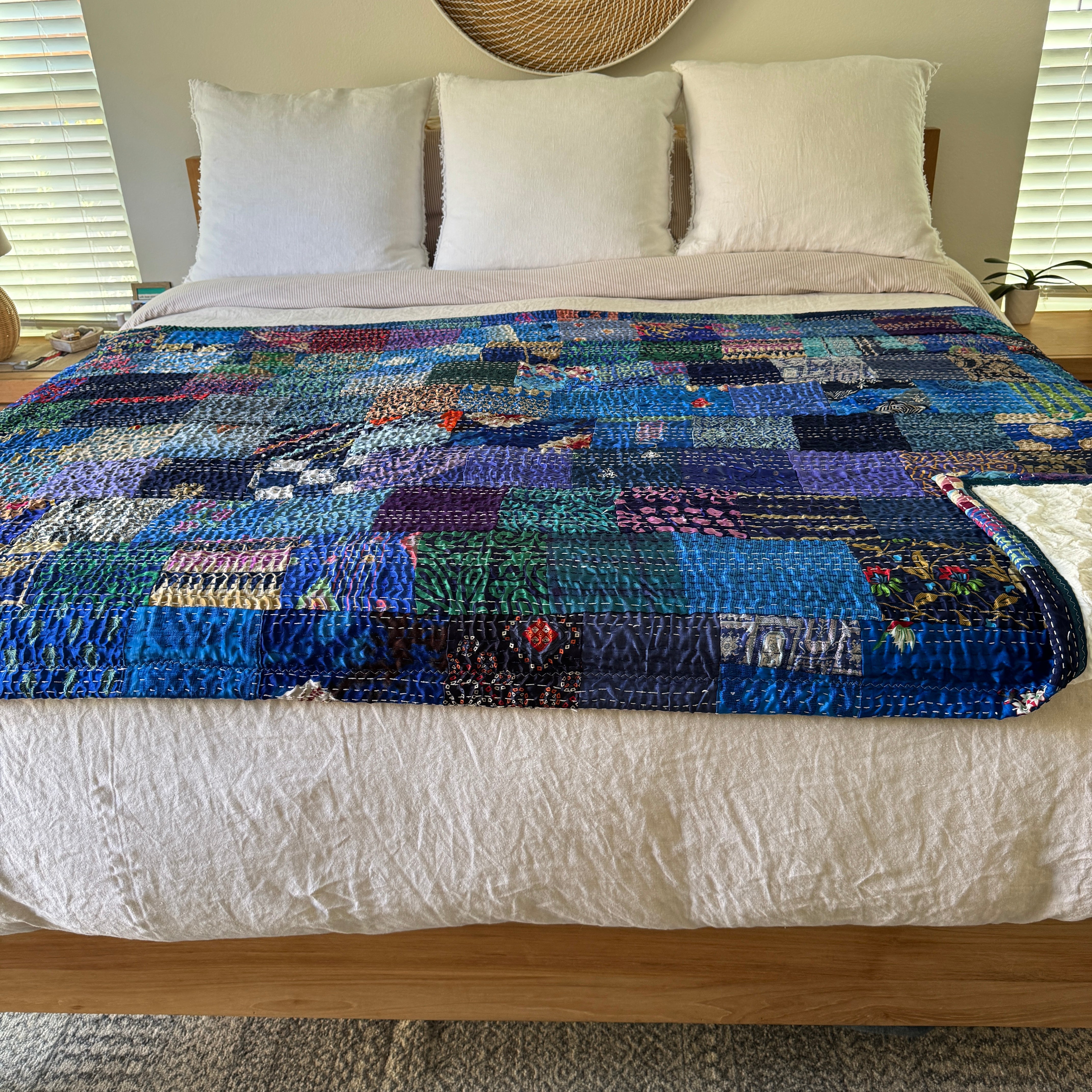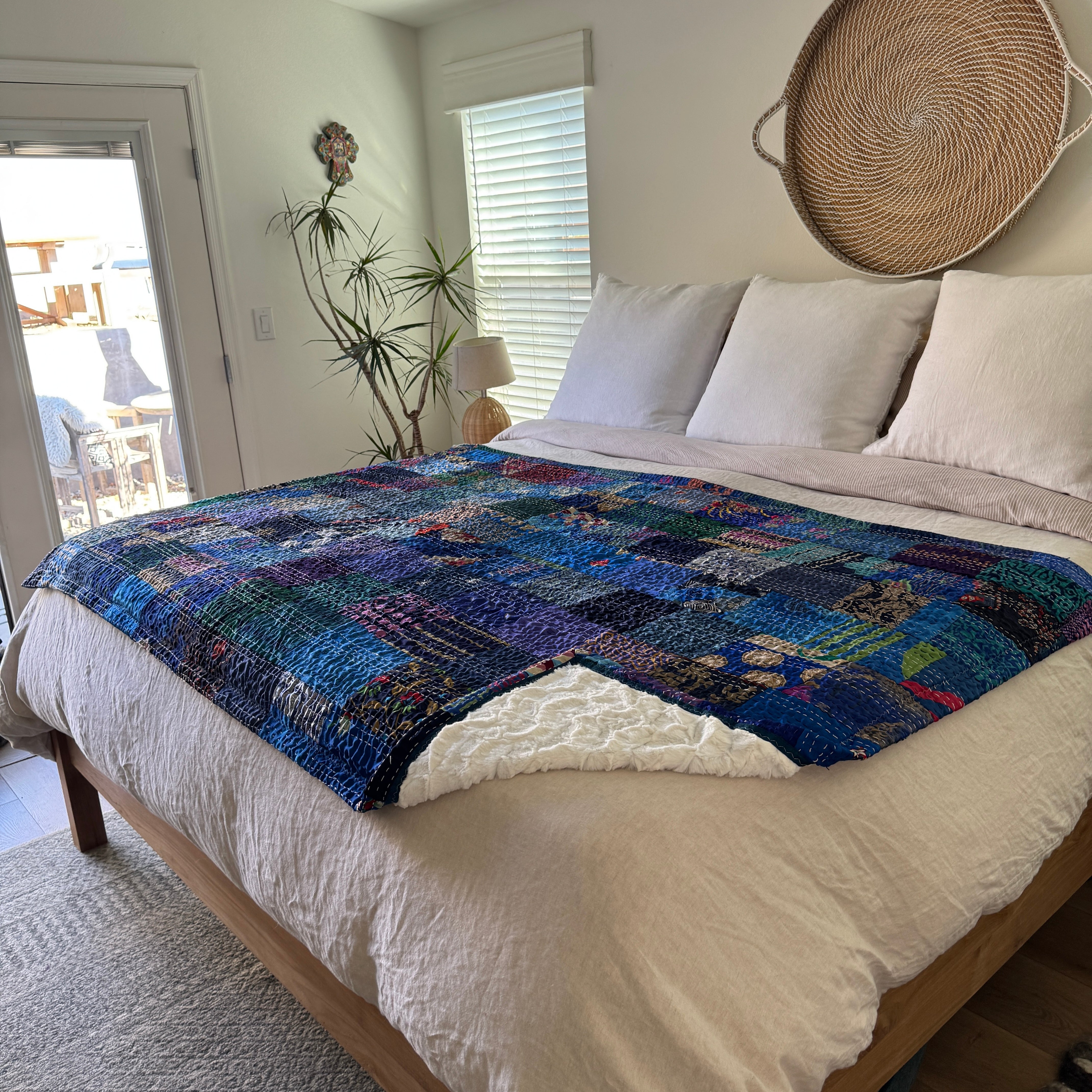 This gorgeous silk, patchwork Kantha is a mix between a Bohemian Dream and my childhood memories. With a universal thread combining fabrics of silk and cotton together, they are then lined with our luxurious Minky Faux-Fur - you will find yourself wrapped in a world of unwavering bliss.