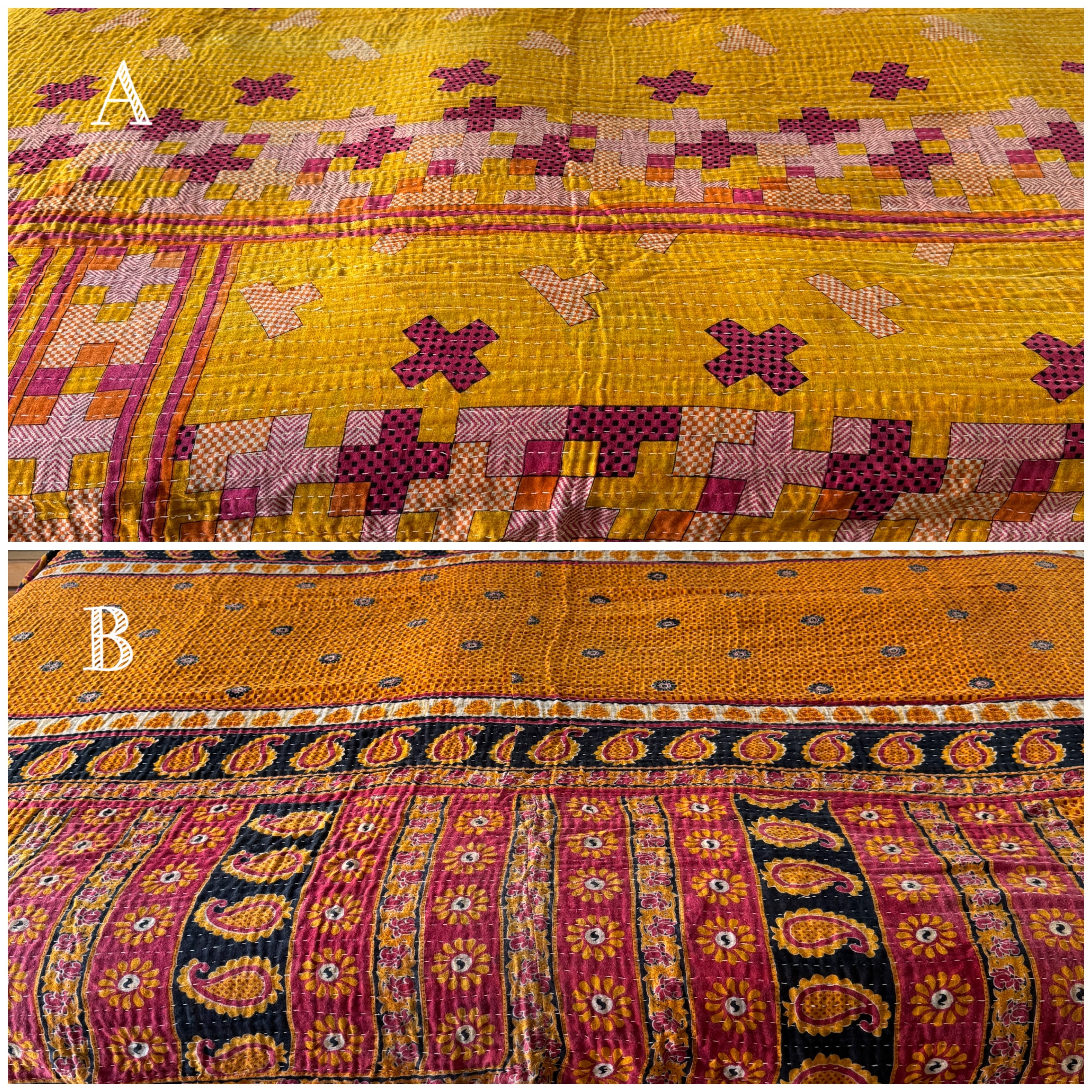 These Kantha quilts were hand stitched in the 1970's in India. There is one running stitch throughout and each blanket takes about 28 days to stitch. There are no two exactly alike as they are all one of a kind, which adds to their unique and eclectic energy. Each side has a different pattern and print.