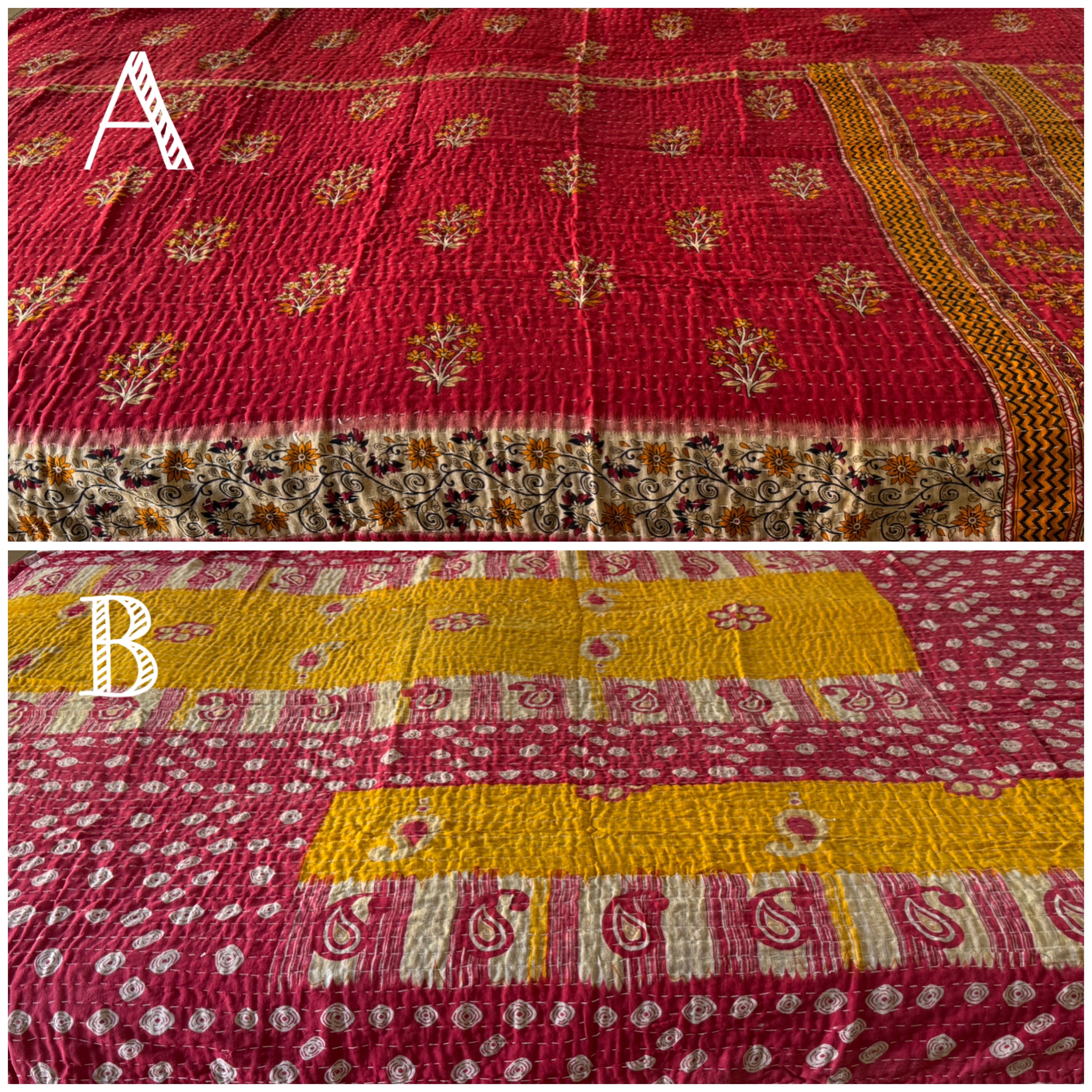 These Kantha quilts were hand stitched in the 1970's in India. There is one running stitch throughout and each blanket takes about 28 days to stitch. There are no two exactly alike as they are all one of a kind, which adds to their unique and eclectic energy. Each side has a different pattern and print.