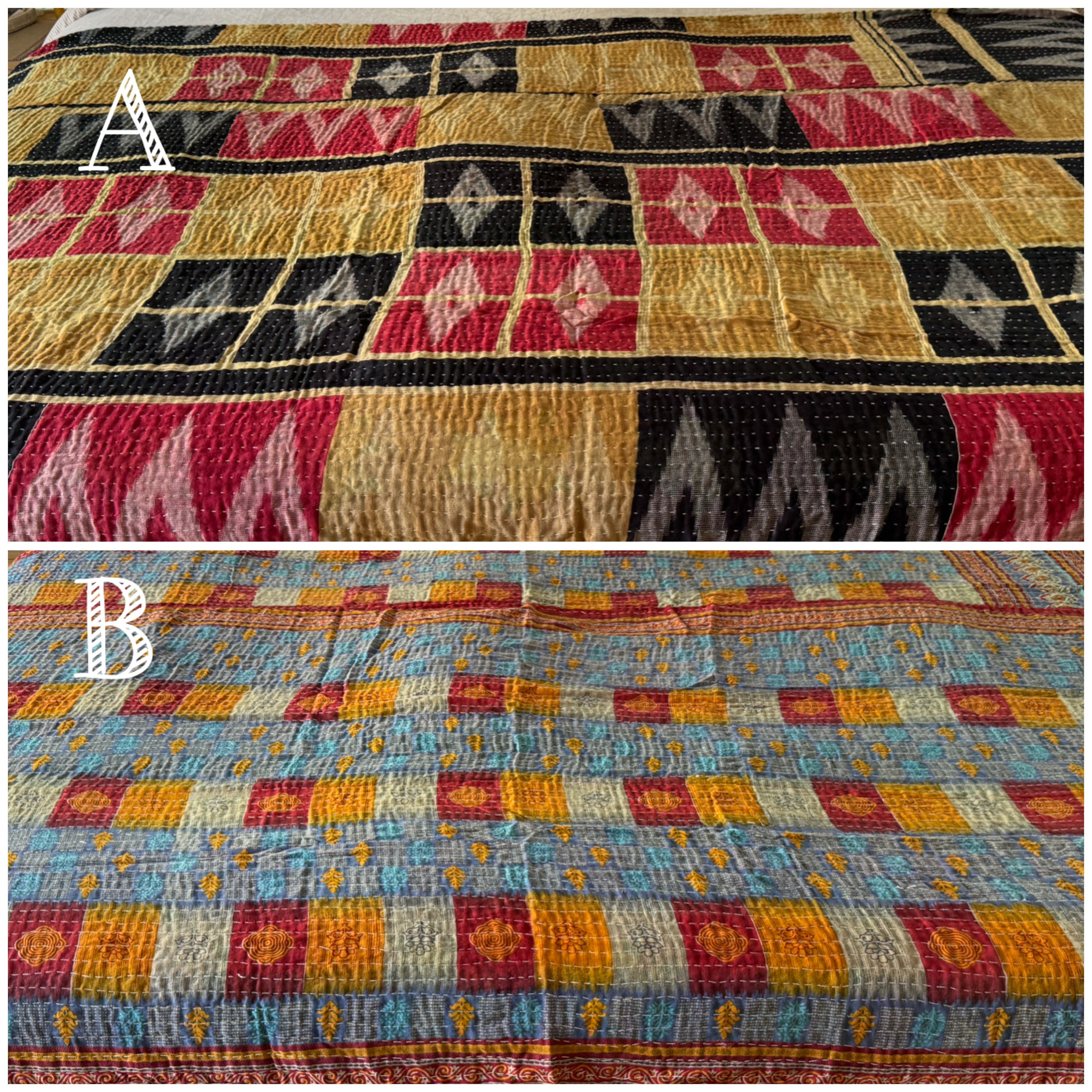 These Kantha quilts were hand stitched in the 1970's in India. There is one running stitch throughout and each blanket takes about 28 days to stitch. There are no two exactly alike as they are all one of a kind, which adds to their unique and eclectic energy. Each side has a different pattern and print.
